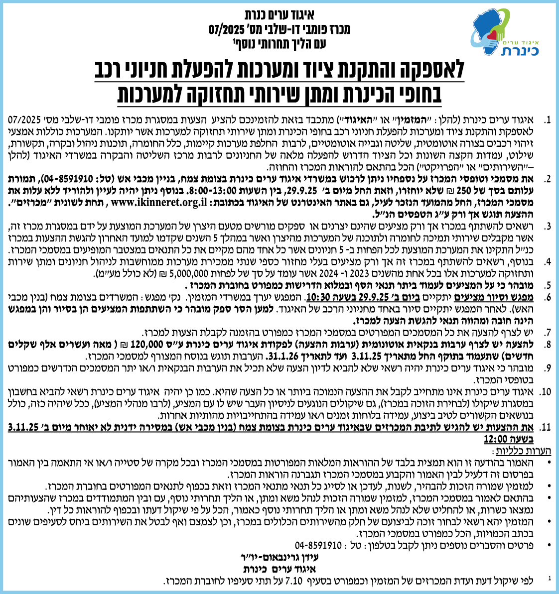 מכרז פומבי דו-שלבי מס' 07/2025 - עם הליך תחרותי נוסף לאספקה והתקנת ציוד ומערכות להפעלת חניוני רכב בחופי הכינרת ומתן שירותי תחזוקה למערכות