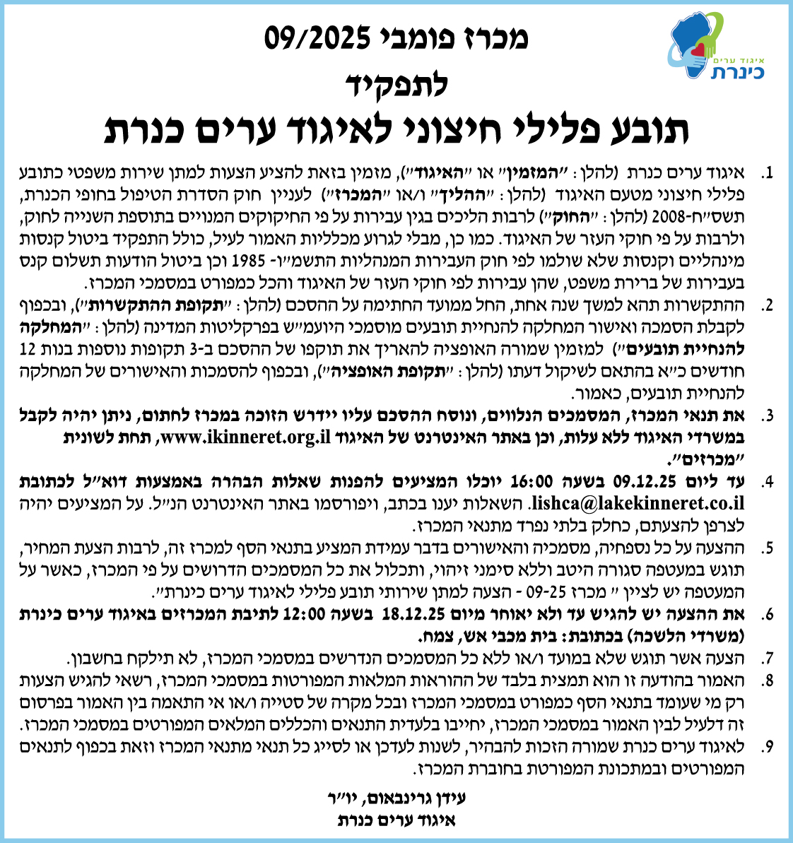 מכרז פומבי 09/2025 לתפקיד תובע פלילי חיצוני לאיגוד ערים כינרת