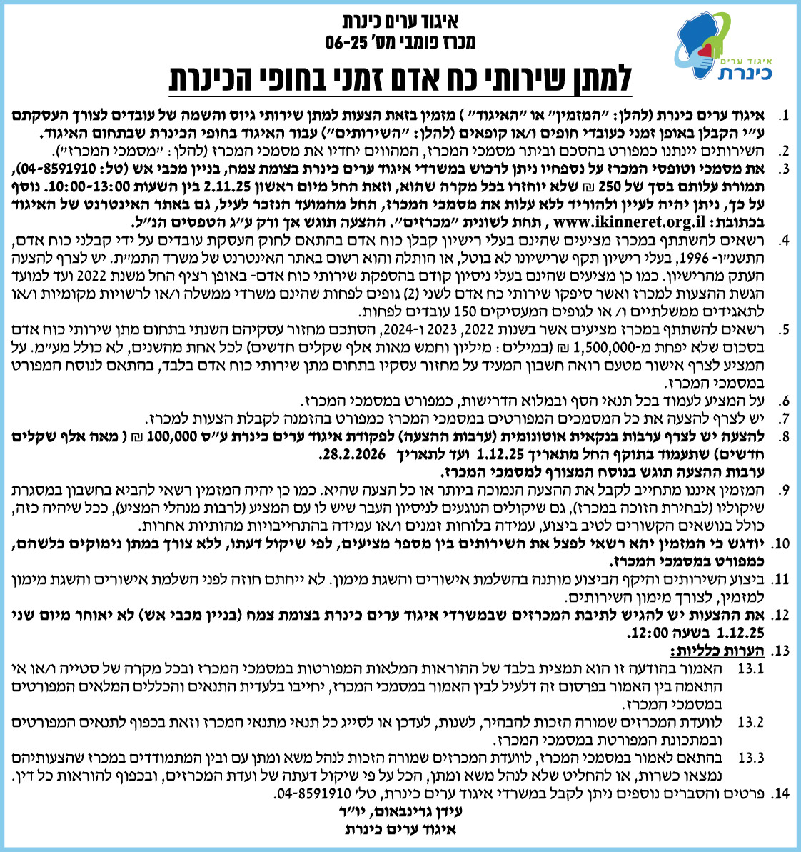 מכרז פומבי 06-25 למתן שירותי כח אדם זמני בחופי הכינרת