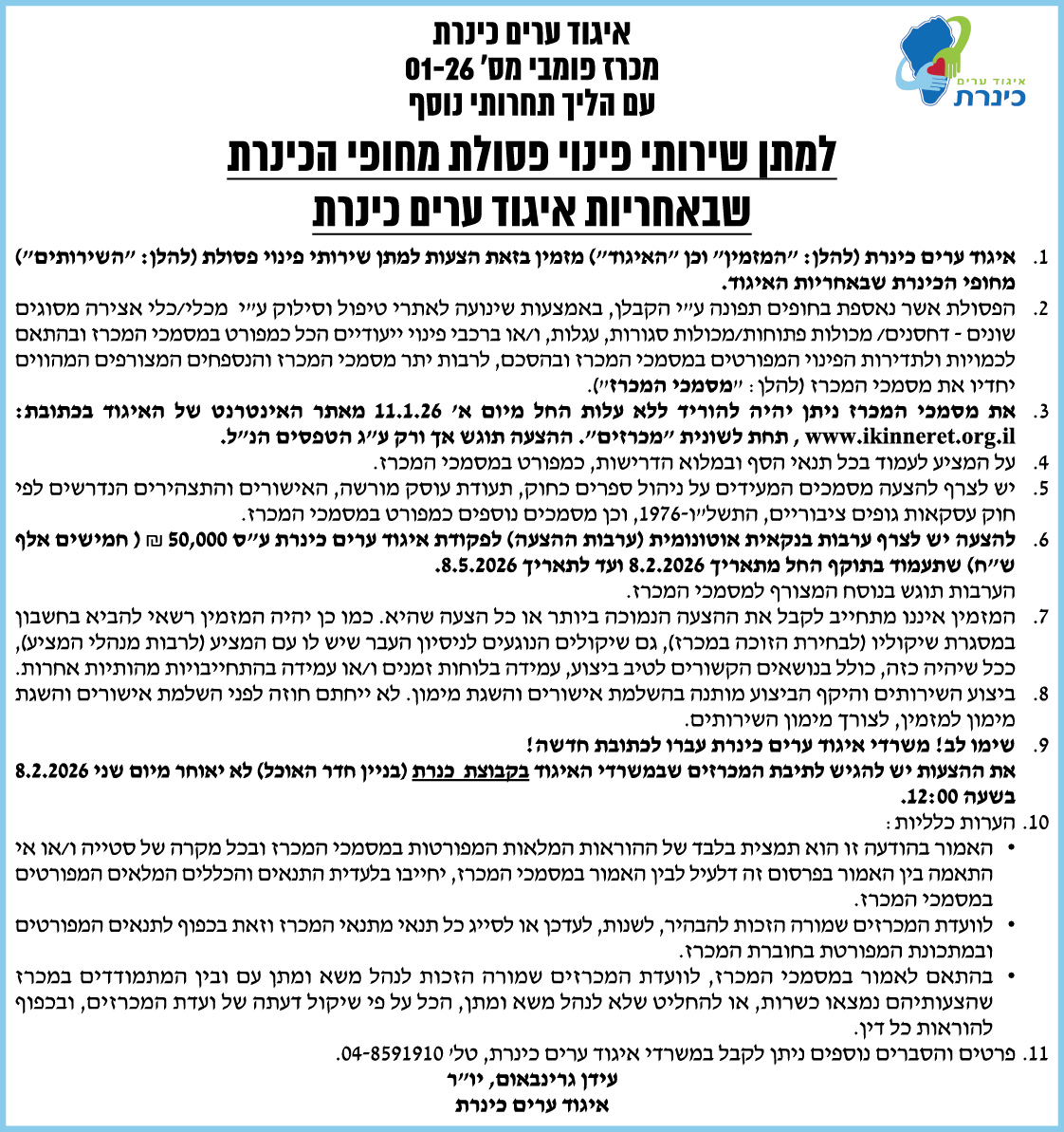 מכרז פומבי 01-26 עם הליך תחרותי נוסף למתן שירותי פינוי אשפה מחופי הכינרת שבאחריות איגוד ערים כינרת